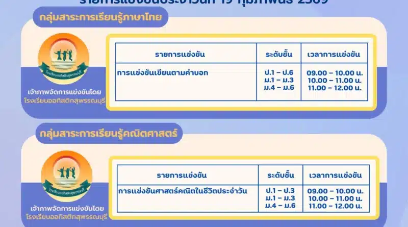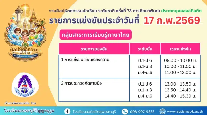 บริหารวิชาการประชาสัมพันธ์ 19 กุมภาพันธ์ 2026 พัชรากร สุวีรานุวัฒน์ 144 Views รายการแข่งขันงานศิลปหัตถกรรมนักเรียน ระดับชาติ ครั้งที่ 73 การศึกษาพิเศษ ประเภทบุคคลออทิสติก ประจำวันที่ 19 กุมภา Read More