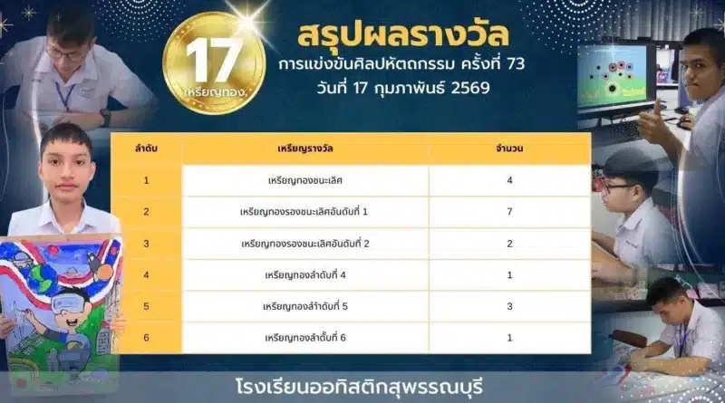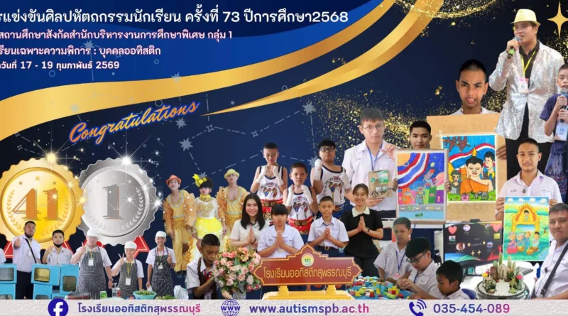 ประชาสัมพันธ์ผลงานนักเรียน 24 กุมภาพันธ์ 2026 พัชรากร สุวีรานุวัฒน์ 202 Views สรุปผลรางวัลการแข่งขันงานศิลปหัตถกรรมนักเรียน ระดับชาติ ครั้งที่ 73 การศึกษาพิเศษ ประเภทบุคคลออทิสติก ของโรงเรียนออทิสติกสุพรรณบุรี เหรียญทอง จำนวน 41 เ Read More