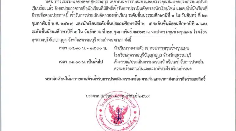 บริหารวิชาการประชาสัมพันธ์ 19 กุมภาพันธ์ 2026 พัชรากร สุวีรานุวัฒน์ 178 Views ฐานการประเมินคัดกรองนักเรียนใหม่ เข้ารับการประเมินตามวัน และเวลา ฐานการประเมินคัดกรอง Read More