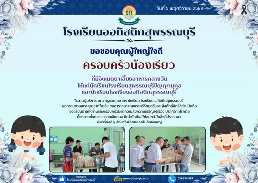 ขอขอบคุณผู้ใหญ่ใจดี ครอบครัวน้องเรียว ที่มีจิตเมตตาเลี้ยงอาหารกลางวัน ให้แก่นักเรียนโรงเรียนออทิสติกสุพรรณบุรี