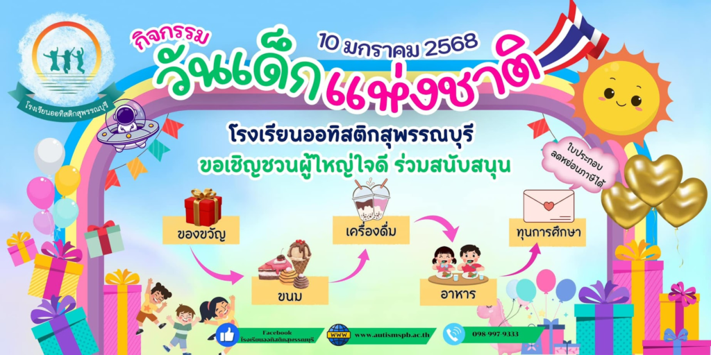 โดยท่านสามารถร่วมสนับสนุนของขวัญ ขนม เครื่องดื่ม อาหาร ทุนการศึกษา หรือสิ่งของต่างๆ เพื่อเป็นของขวัญและกำลังใจให้กับเด็กๆ โรงเรียนออทิสติกสุพรรณบุรี