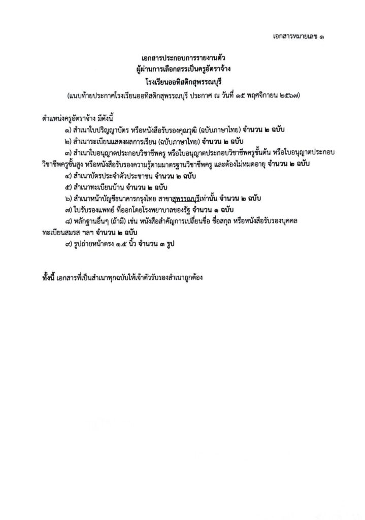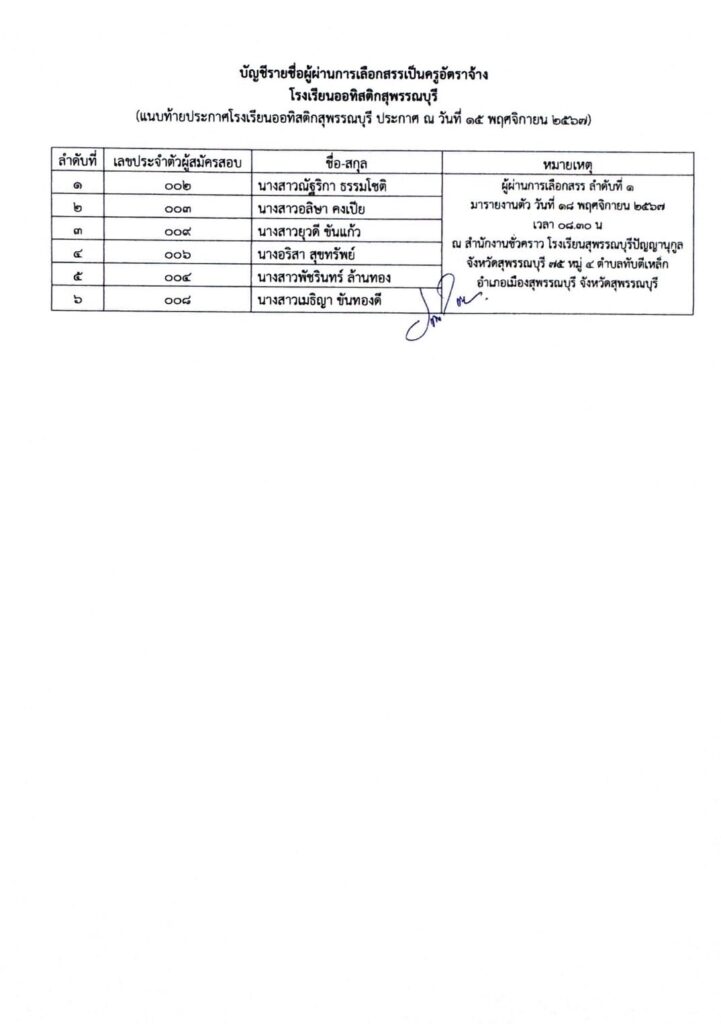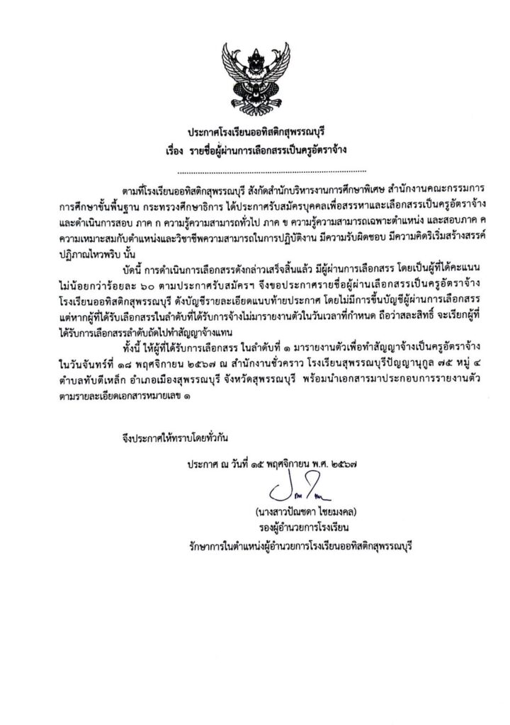 ให้ผู้ผ่านการเลือกสรร ลำดับที่ 1 มารายงานตัว ในวันที่ 18 พฤศจิกายน 2567 ณสำนักงานชั่วคราว โรงเรียนสุพรรณบุรีปัญญานุกูล จังหวัดสุพรรณบุรี