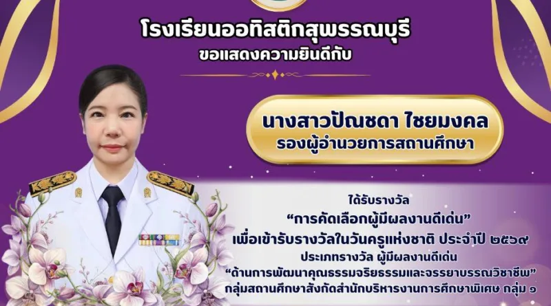 บริหารงานบุคคลประชาสัมพันธ์ผลงานบุคลากร 13 มกราคม 2026 พัชรากร สุวีรานุวัฒน์ 352 Views โรงเรียนออทิสติกสุพรรณบุรี ขอแสดงความยินดีกับ ผู้บริหาร และคณะครู เนื่องในโอกาสได้รับรางวัล “การคัดเลือกผู้มีผลงานดีเด่น โรงเรียนออทิสติกสุพร Read More